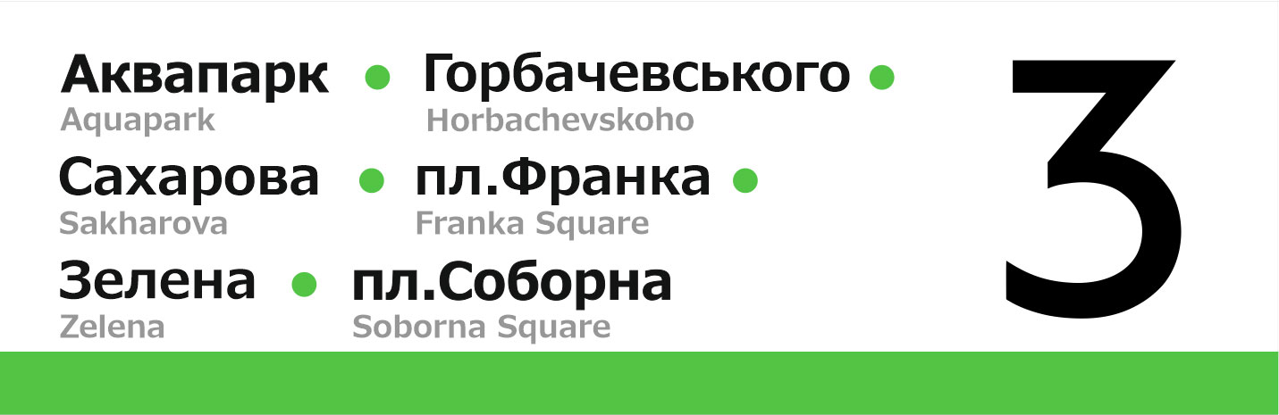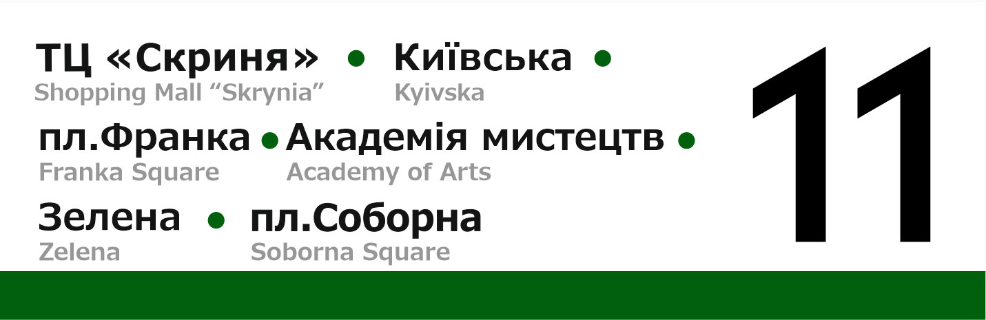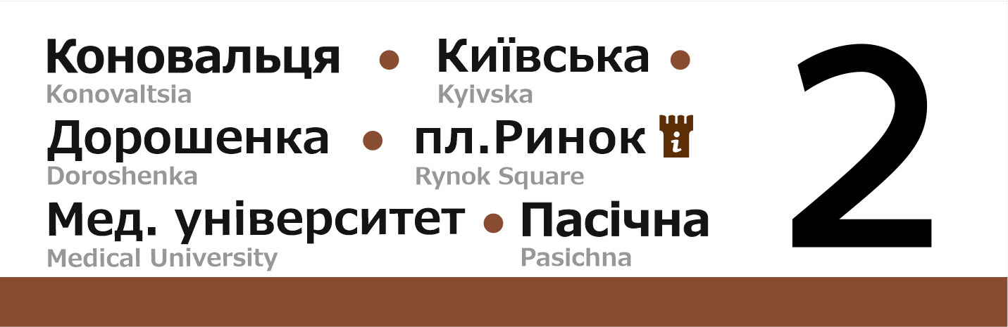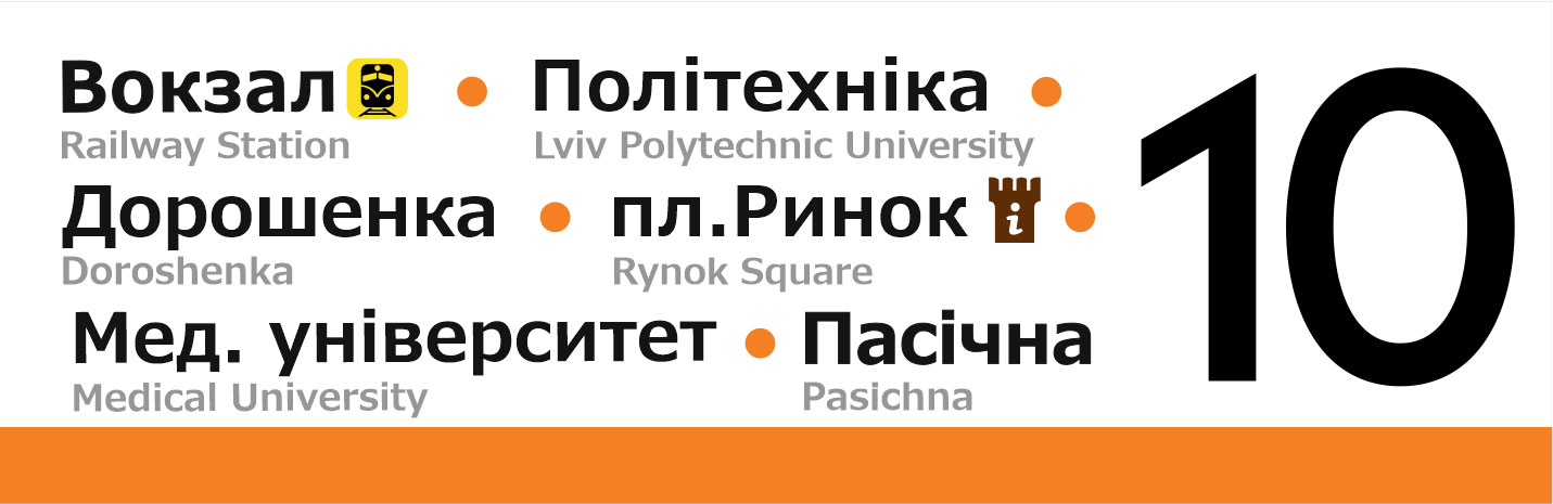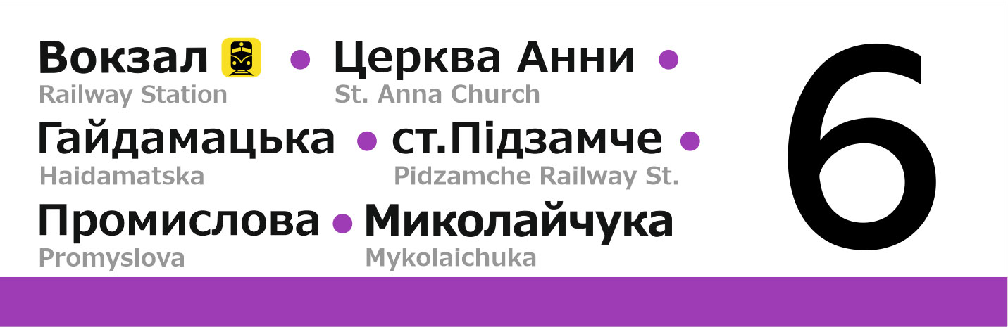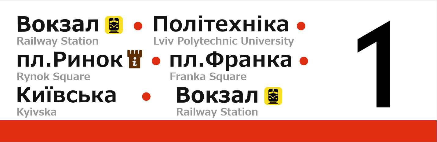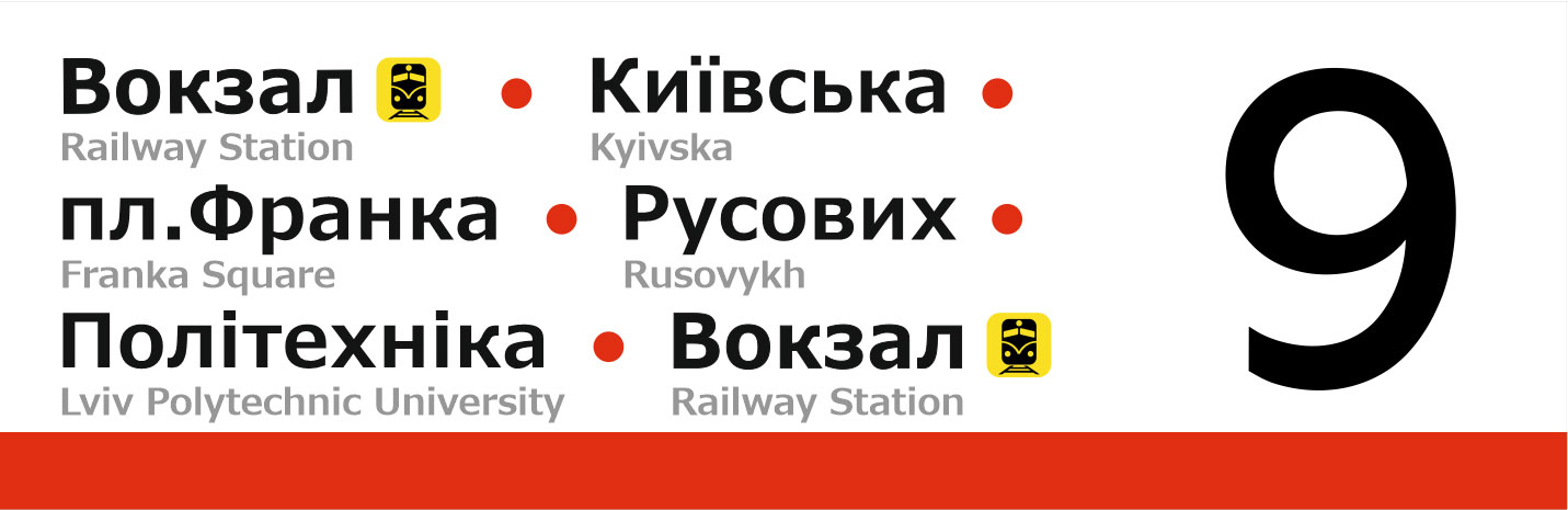 Бокові таблички для трамваїв Львова. Із зовнішньої сторони перелік основних зупинок, з внутрішньої сторони — лінійна схема маршрута.
