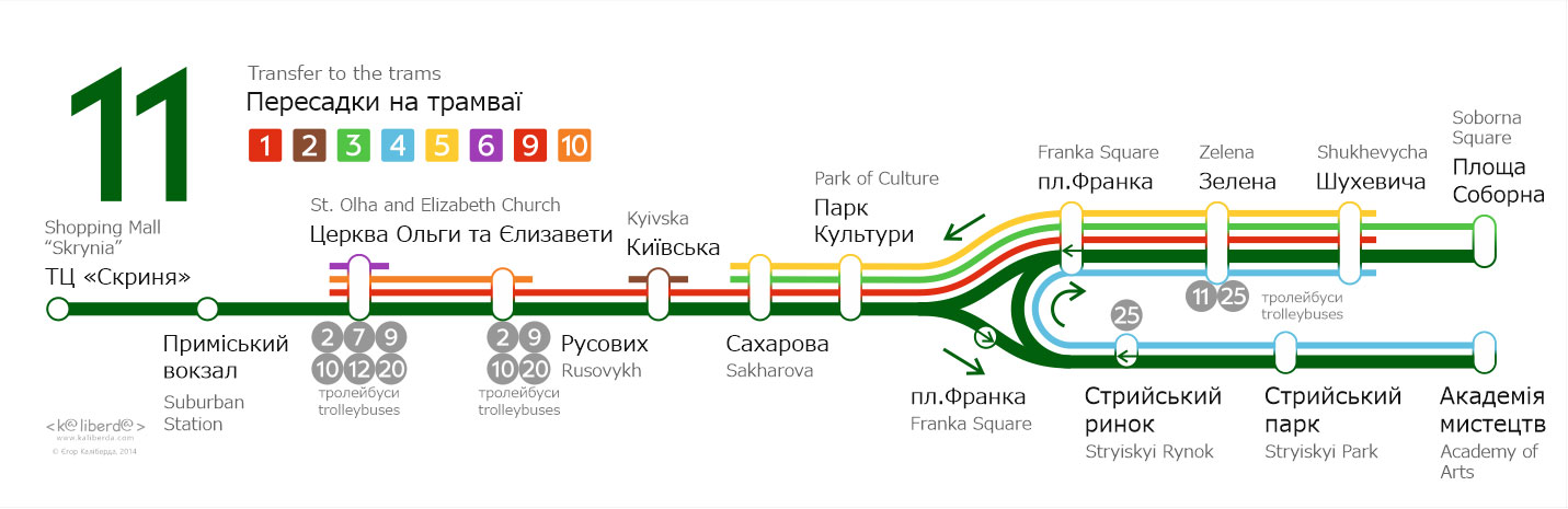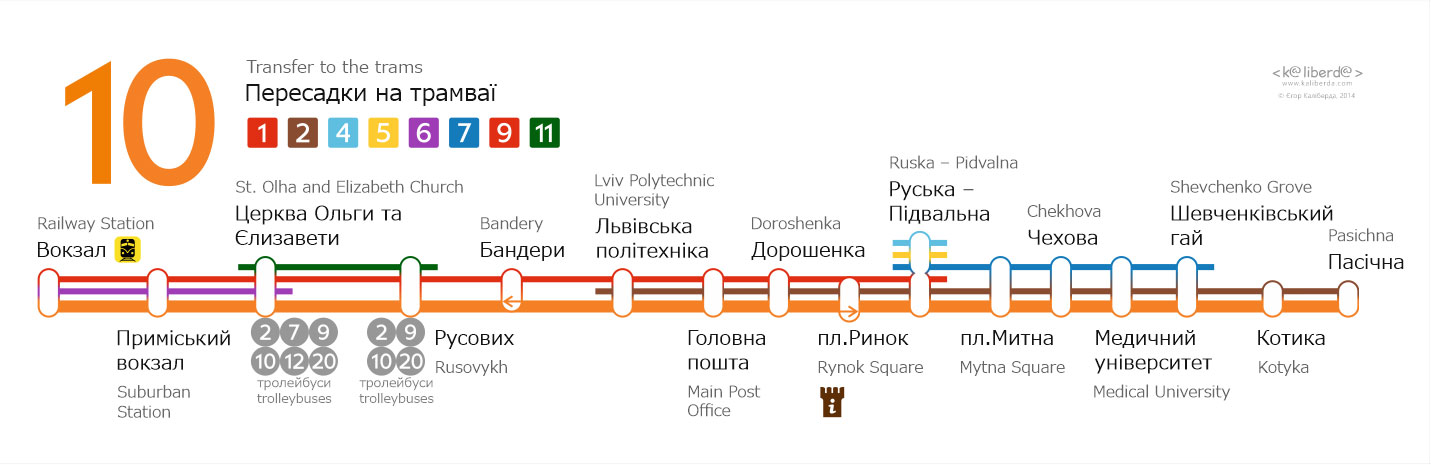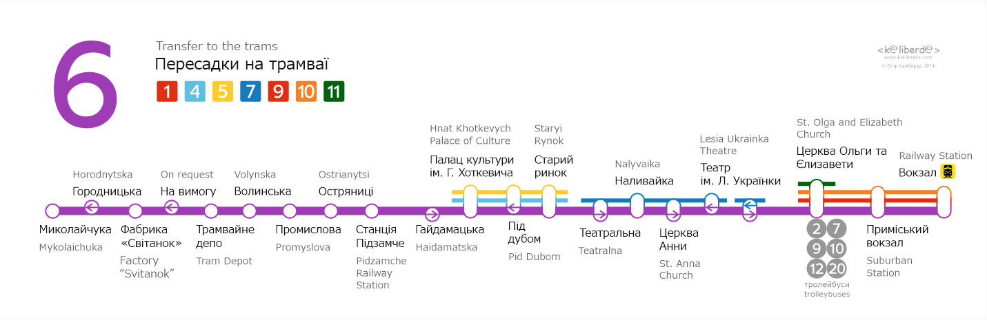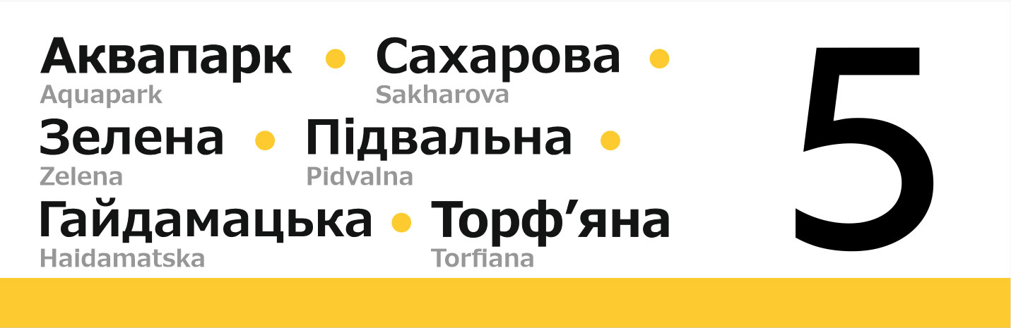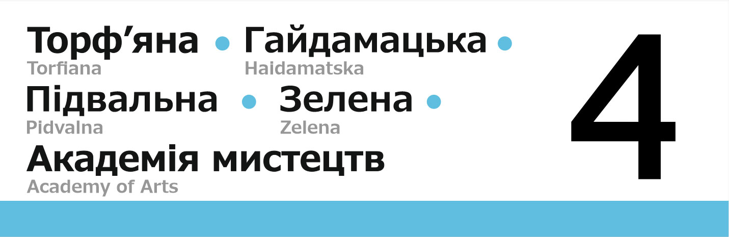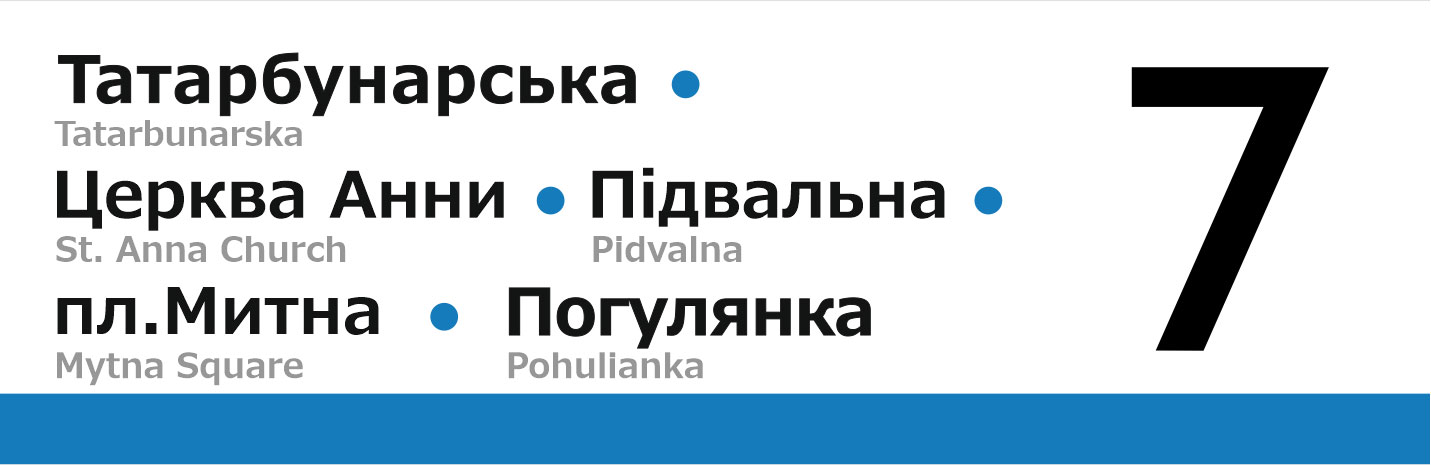Бокові таблички для трамваїв Львова. Із зовнішньої сторони перелік основних зупинок, з внутрішньої сторони — лінійна схема маршрута.
