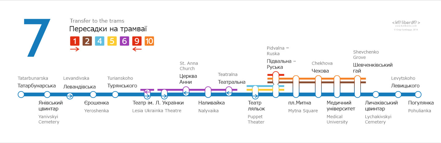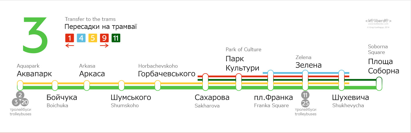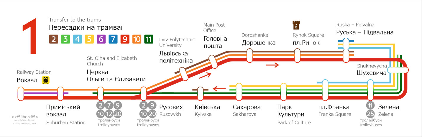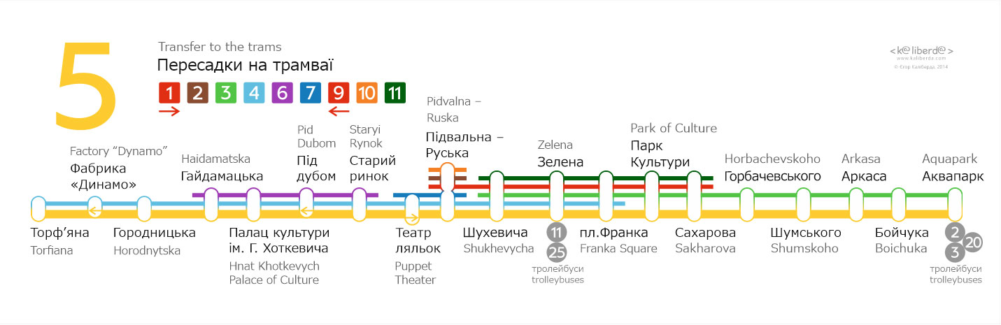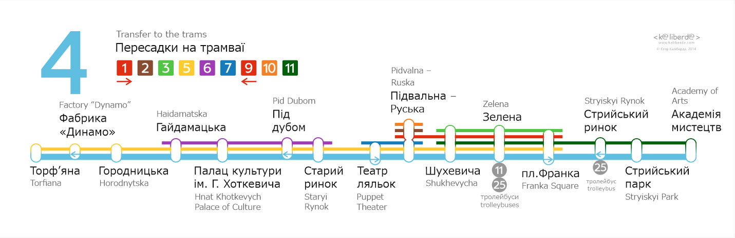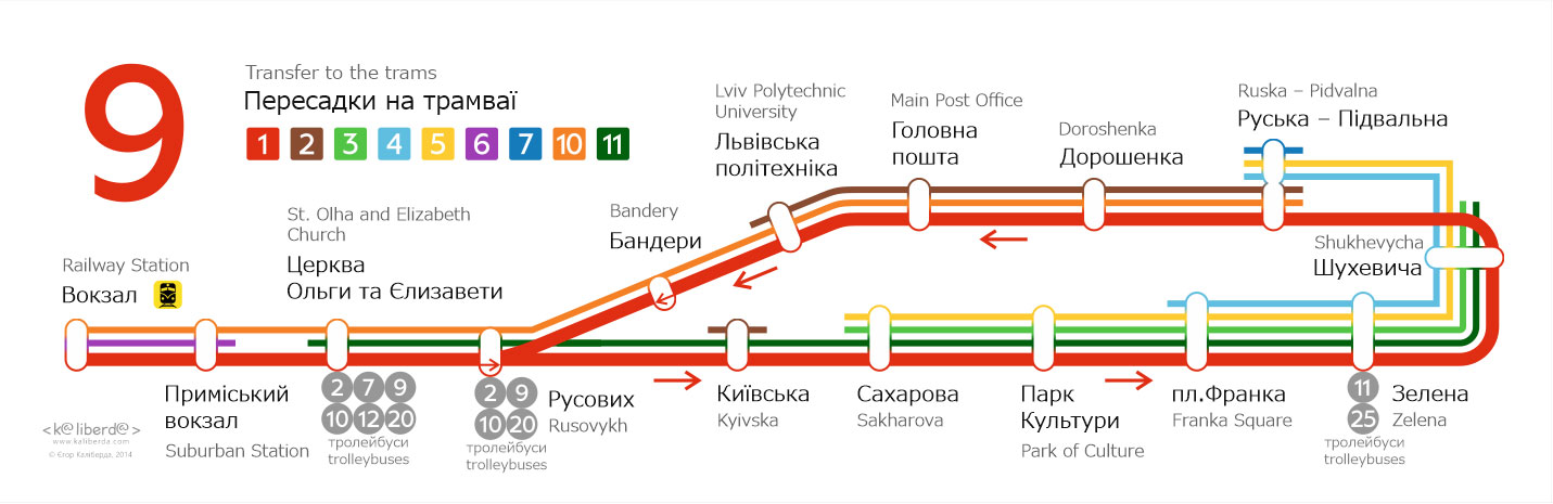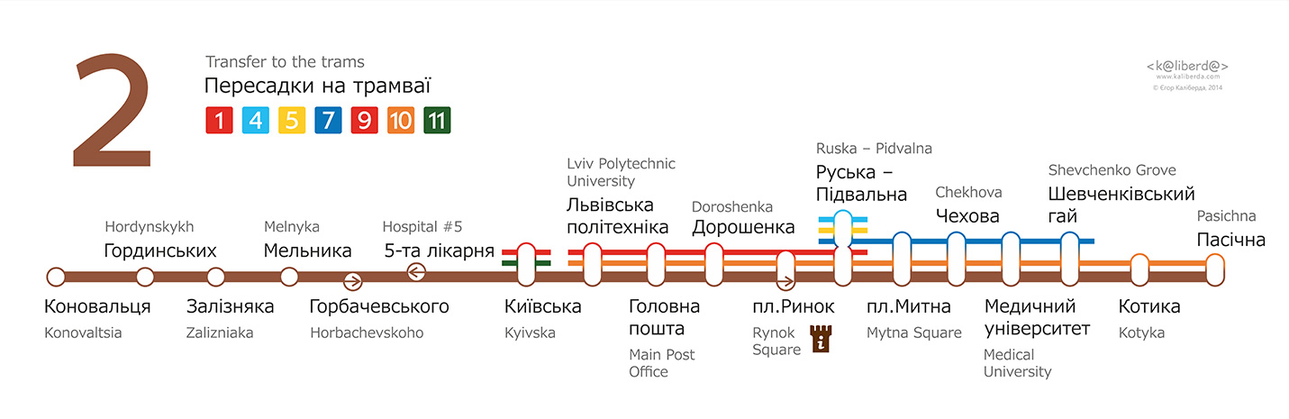 Бокові таблички для трамваїв Львова. Із зовнішньої сторони перелік основних зупинок, з внутрішньої сторони — лінійна схема маршрута.